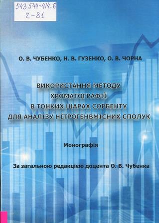 Чубенко, О. В. Використання методу хроматографії в тонких шарах сорбенту для аналізу нітрогенвмісних сполук : присвяч. пам’яті доктора фармацевтичних наук, професора Геннадія Павловича Петюніна : монографія / О. В. Чубенко, Н. В. Гузенко, О. В. Чорна ; дар. О. В. Чорна ; заг. ред. О. В. Чубенко ; ХНМУ. — Харків : Іванченка І. С., 2024. — 156 с.
