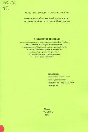 Методичні вказівки до проведення практичних занять, самостійної роботи та виконання індивідуального завдання з дисципліни “Медіапланування” : для здобувачів першого (бакалавр) рівня вищої освіти освітньої прогр. “Маркетинг” за спец. 075 “Маркетинг” усіх форм навч. / НТУ “ХПІ” ; уклад. О. М. Кітченко. — Харків : НТУ “ХПІ”, 2024. — 36 с.