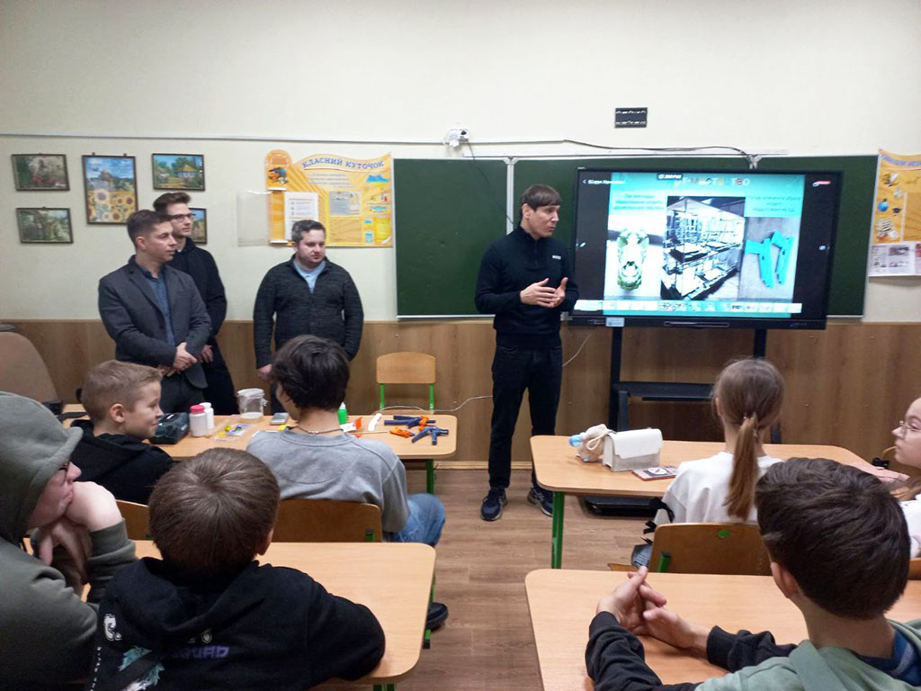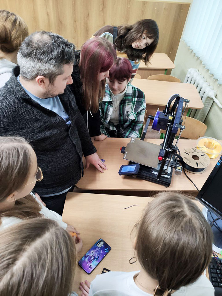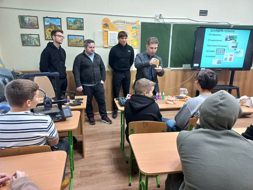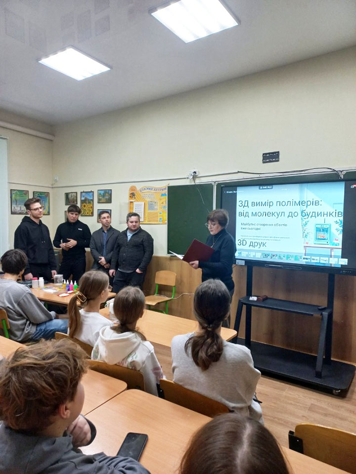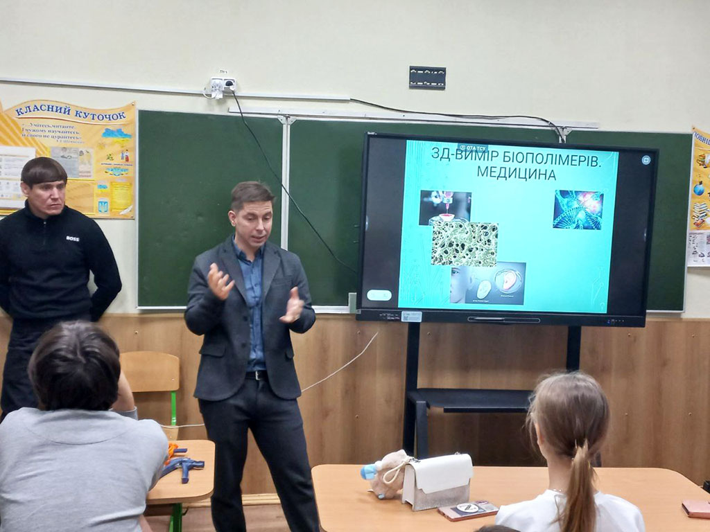 Команда нашого університету у складі викладачів кафедри Технологія пластичних мас і біологічно активних полімерів, а саме: професора Володимира Лебедєва, доцента Артема Карєва, старшого викладача Андрія Воронкіна та завідуючої відділом науково-технічної бібліотеки Лідії Бондаренко розпочали новий напрямок роботи для учнів старших класів КЗ Покотилівський ліцей № 2. Сьогоднішнє покоління школярів спонукає до нових та оригінальних форматів зустрічей. Тож для практичної роботи з матеріалами було представлено 3D-принтер, щоб школярі доторкнулися до сучасних інтегрованих технологій 3D-біодруку клітин полімерів і змогли створювати об’єкти різної складності шляхом пошарового нанесення полімерного матеріалу.